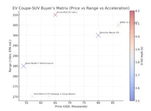 the Buyer’s Matrix of — comparing price vs. range with 060 mph times indicated by bubble size (larger = faster).
