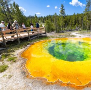 Hot springs: Grand prismatic spring (largest spring in the U.S. with rainbow colors).