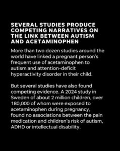 - E.g. the drugmakers (manufacturer of Tylenol, Kenvue) firmly deny any causal relationship, claiming that according to independent and good science, the intake of acetaminophen is not responsible to autism.